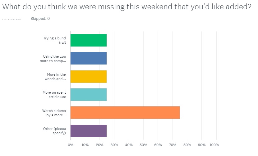 Click the images below to see what people liked most about the seminar and trailing, and suggestions for future seminars and goals! These are anonymous (well, except for one positive comment where a dog is named!) You can see pictures of the participants in the photo gallery.