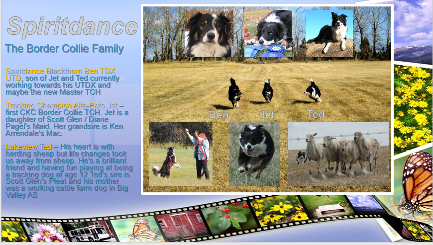 Jet and Ben, mother and son, are the only Border Collies in Canada so far who are Tracking Champions. They are stockdog bred, working Border Collies and come from Scott Glen’s breeding. Scott Glen is a World Class competitor and it is an honour to have had these dogs. Ben is now 13.5!